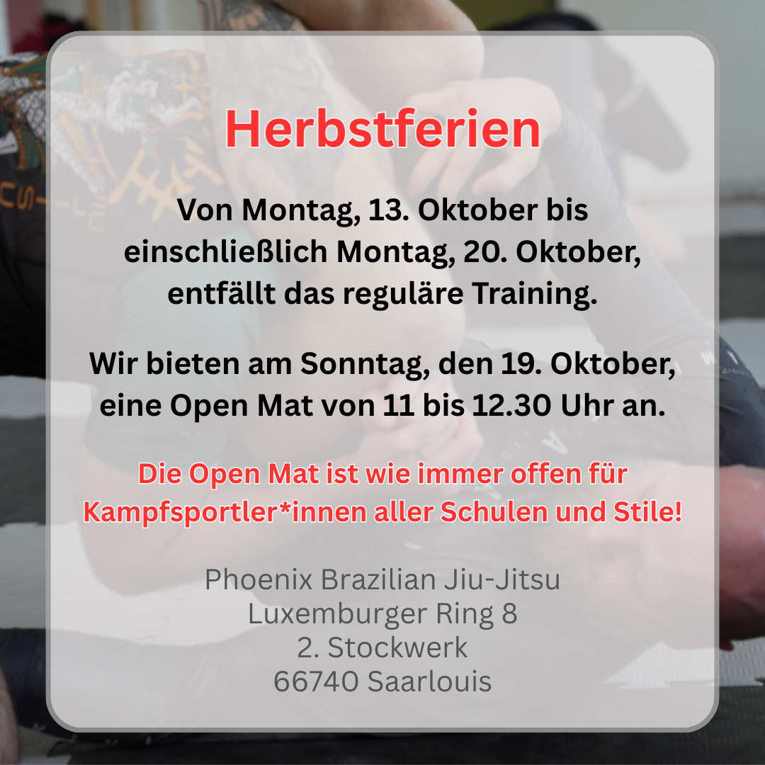 Von Montag, 13. Oktober bis einschließlich Montag, 20. Oktober findet kein reguläres Training statt. Dafür bieten wir eine Open mat…
